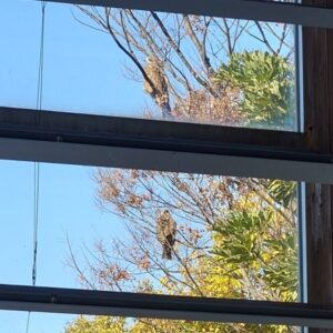 欅が日に日に秋色に染まり始めた10月中頃から、今年もプールサイド西側窓越しに、枝に寛ぐ鳶(とんび)を見かけるようになりました。落葉前の枯れ葉色と同色の鳶は何に襲われる心配もないかの如く、足で翼を伸ばしたり、嘴で尾羽を整えたりと羽繕いに余念がありません。一しきりの手入れが済むと、鳶は微動だにしない時をしばらくゆったりと過ごして何処かへと飛んでいきます。獲物を探しにでも行くのでしょうか。
