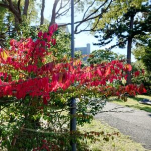 ニシキギが色づいてきました。正門脇で紅がいつにも増して鮮やかです。緑の葉がまだ半分は残っており、好対照をなしています。もうじき全身を紅に染めていくことでしょう。深まりゆく秋、年に一度の自己主張は、けれん味なく進んでいきます。プールの帰りを少しばかり遠回りして正門からとし、お楽しみいただければと思います。