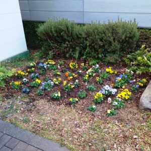 ブランチの花屋さん“花秀”で、パンジーのケース売り(24苗)が安くなっていました。2ケース求めてプール玄関前の花壇に植えました。花壇はしばらくほったらかしにしておいたので、まずは耕しから始めました。植栽班からウッドチップをもらってきて鋤込み、ポットのまま仮置きをして配置を確かめて定植しました。バランスよく植えることができたでしょうか。パンジーはこの寒い時期が大好き、花開いた苗もたくさんあり、蕾もいっぱい付けています。暖かくなるまで楽しめそうです。土いじりの作業がだいぶ腰に来るようになりました。休み休み、ゆっくりゆっくりと言い聞かせながら職員ともどもの楽しいひと時でした。