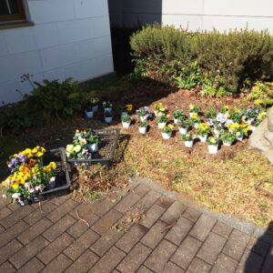 ブランチの花屋さん“花秀”で、パンジーのケース売り(24苗)が安くなっていました。2ケース求めてプール玄関前の花壇に植えました。花壇はしばらくほったらかしにしておいたので、まずは耕しから始めました。植栽班からウッドチップをもらってきて鋤込み、ポットのまま仮置きをして配置を確かめて定植しました。バランスよく植えることができたでしょうか。パンジーはこの寒い時期が大好き、花開いた苗もたくさんあり、蕾もいっぱい付けています。暖かくなるまで楽しめそうです。土いじりの作業がだいぶ腰に来るようになりました。休み休み、ゆっくりゆっくりと言い聞かせながら職員ともどもの楽しいひと時でした。