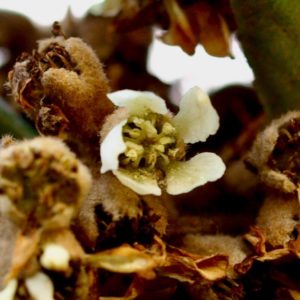 冬至を迎えて寒さも本番です。そんな中、暖かそうな起毛のおくるみに包まれながら咲くのがビワ(枇杷)の花です。右側の開いたばかりの花には早速小さな虫が。このなんとも言えない甘い香りには虫ならずとも惹かれます。