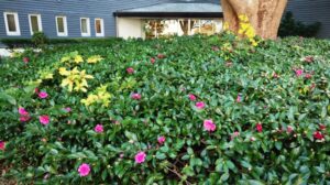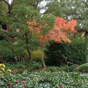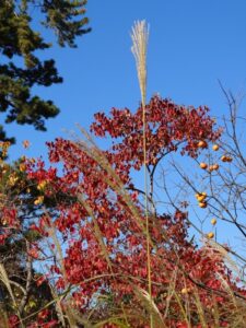 太陽の郷玄関前が彩り豊かです。ロータリー中央で寒椿が咲き始めました。寒椿の間からは、つわぶきが黄花を覗かせ、千両万両が赤い実を稔らせています。ロータリー外縁ではハゼノキが紅く色付き、院長室棟のかたわらではナンキンハゼがこれもまた紅に染まって隣の柿の実と互いを引き立てあっています。そしてその前でススキが一本、自己主張するかのごとく青空にすっくと伸びています。季節は晩秋から初冬へ、こごませたくなる背をシャキッとさせねばと言い聞かせています。
