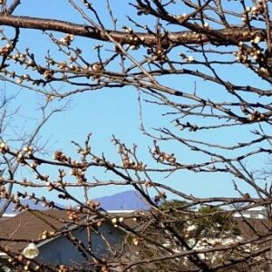1月5日は二十四節季の小寒、寒の入りでした。太陽の郷玄関ロータリー脇の早咲きの梅が季節到来と言わんばかりにほころび始めていました。梅の枝越しに遠く見えるのは大山、この年の弥栄をたぶん見えているであろう大山阿夫利神社に託さんと、両の手を合わせました。